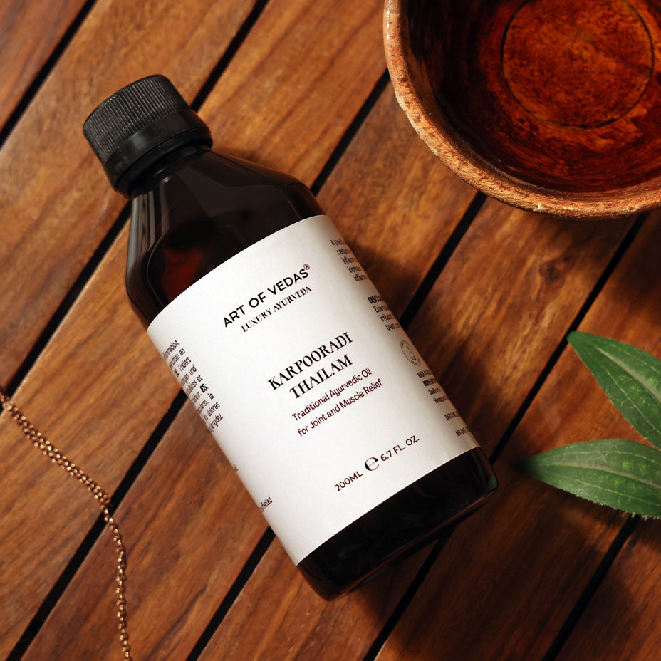 Classical warming body oil prepared in a sesame base with Karpoora (camphor) and kapha-reducing herbs. Traditionally used for Abhyanga/Padabhyanga to stimulate local circulation, ease cold-dominant stiffness and heaviness, and keep the chest–back region comfortable in cool seasons balancing Vāta Kapha.