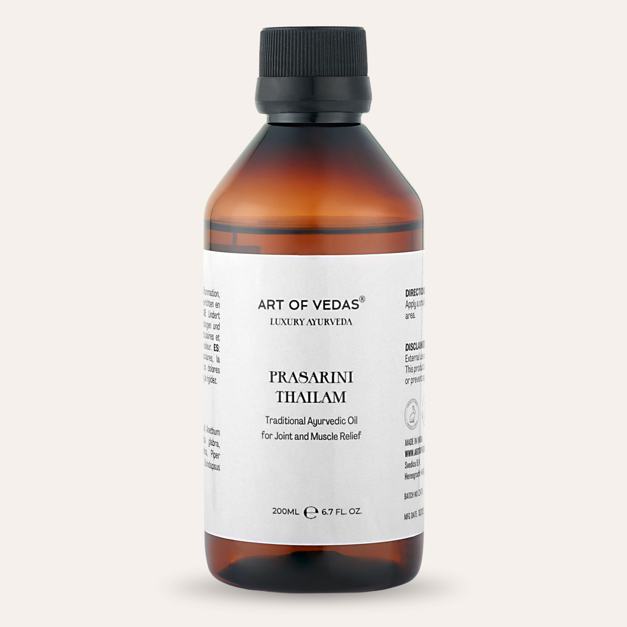 Classical Vāta-śāmaka oil prepared in a sesame base with Prasārinī (Paederia foetida) by the traditional taila-pāka vidhi. Used in Kerala practice to nourish māṃsa–snāyu–sandhi (muscles, ligaments & joints), ease stiffness, and support free movement—especially around the lower back, hips, knees and shoulder.